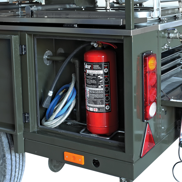 The cooking equipments that are produced according to demand, works with gas system. Gas can be connected to system through external tubes. It may be produced also with liquid LPG tank and evaporation system. It is distributed to necessary points with fitment in order to provide all cooking equipments to work at the same time. We have fire extinguisher tube and cabinet in our car according to risk of fire.